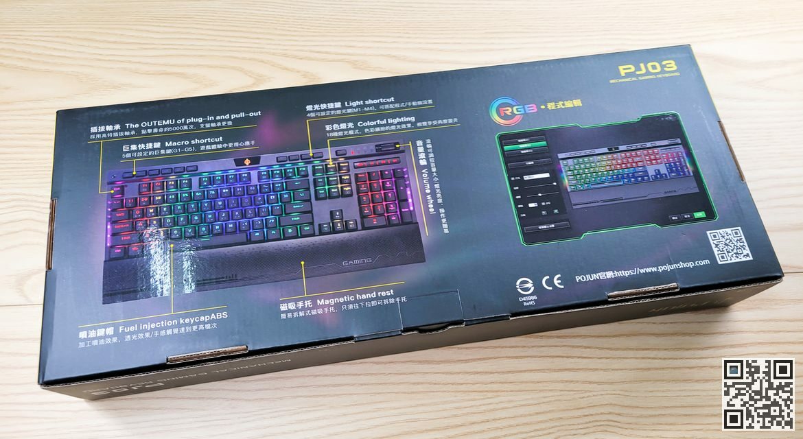 秉持著打造平價的電競周邊產品,設計出擁有上述優點,並且容納更多優點的產品,今天介紹這把 PJ03 RGB機械式鍵盤,夾帶著相當大量的特色融合,除了常見的燈光、機械軸、巨集、程式之外,還加入了替換軸體的熱插拔軸體功能,讓玩家想要更進一步的替換軸體也相當的輕鬆。