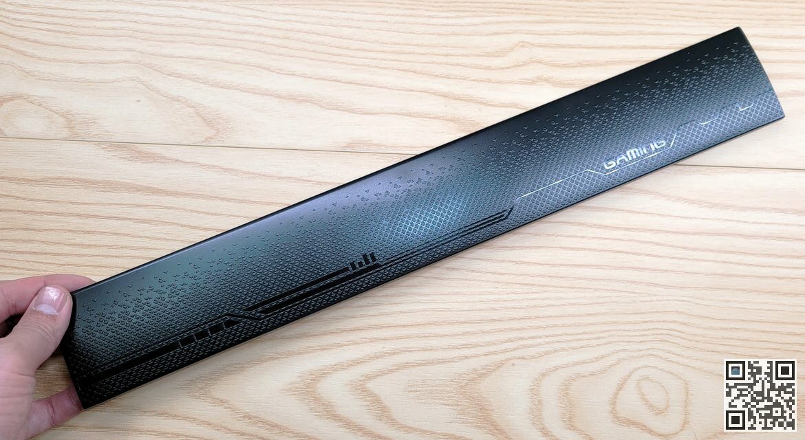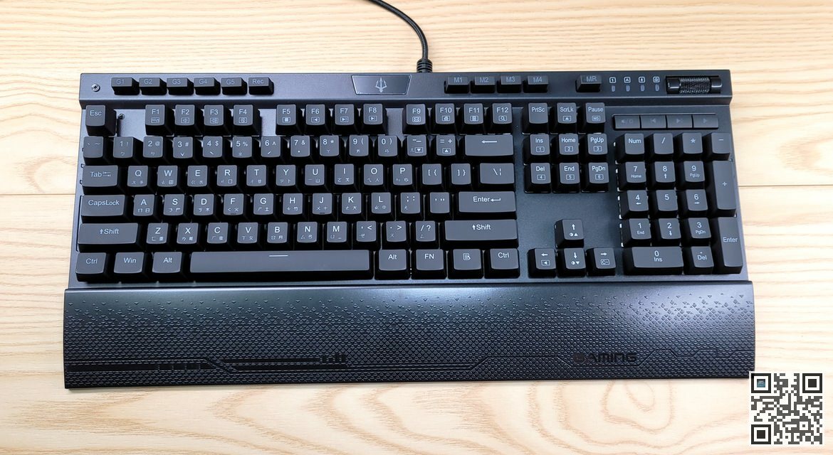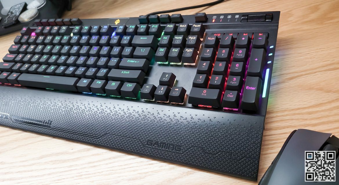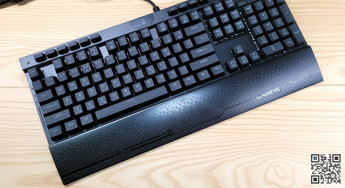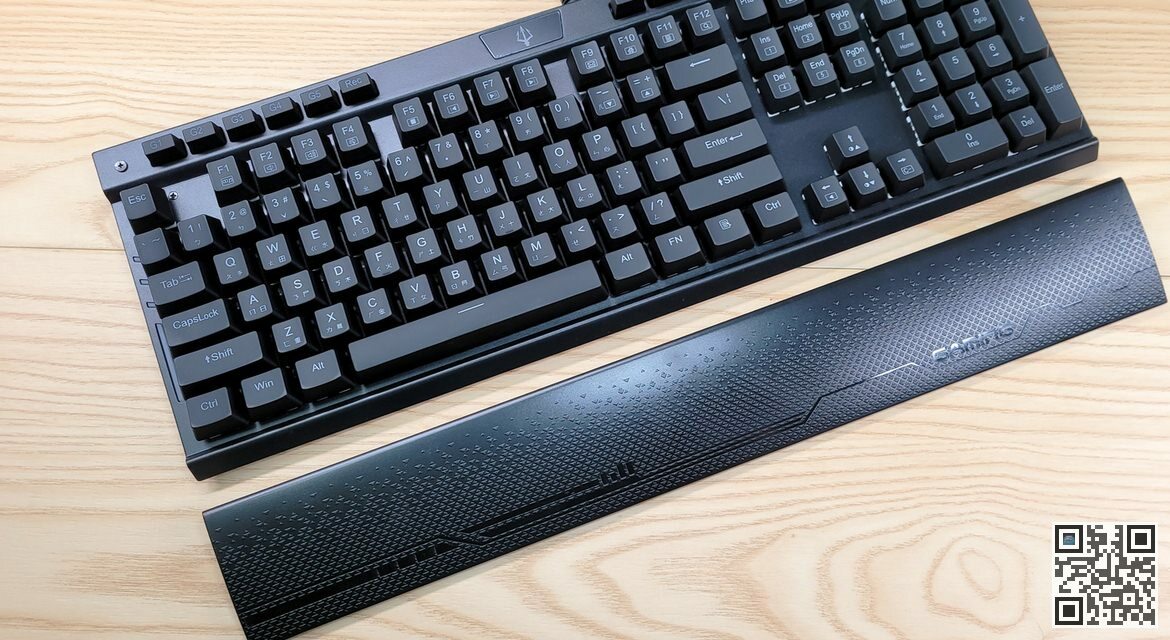 鍵盤的手托設計,表面還有造型顆粒,壓上 GAMING 壓字。