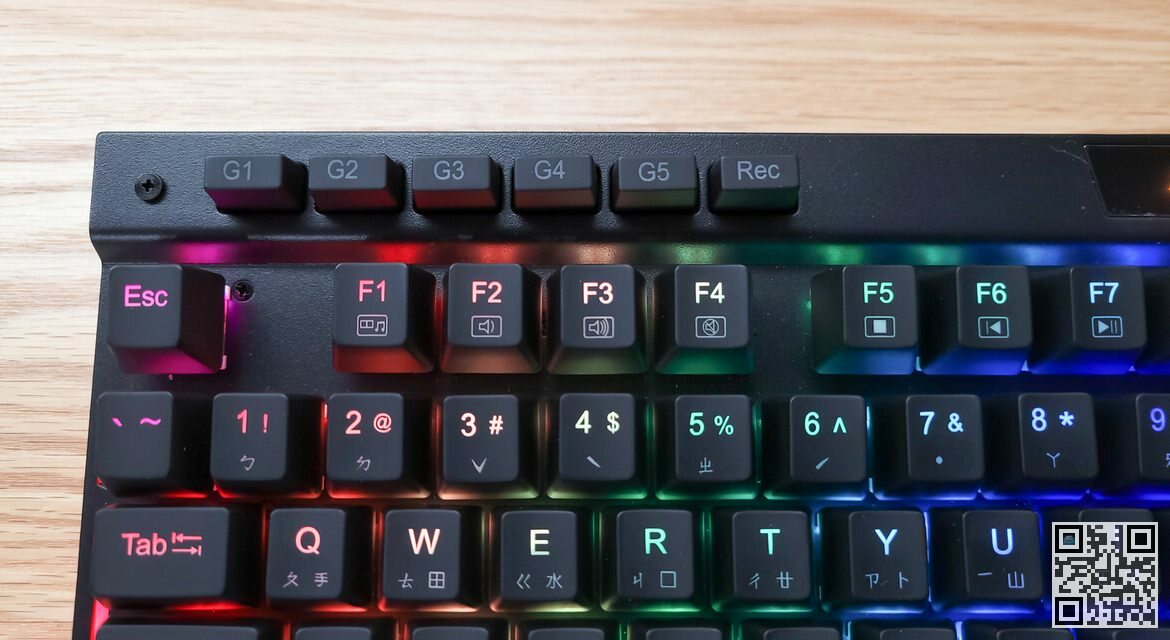 鍵盤,最上方為巨集區,使用方式也相當的簡單, REC 按下之後啟動錄製,選擇 G1~G5 巨集鍵錄製,燈號快閃後開始錄製,可錄製64個按鍵,30秒後自動結束錄製,或是按下 REC 錄製完畢,只需要重複按下對應的錄製按鈕就可以重複播放錄製的按鍵,FN+REC 可清除所有錄製的巨集。