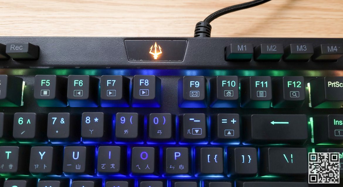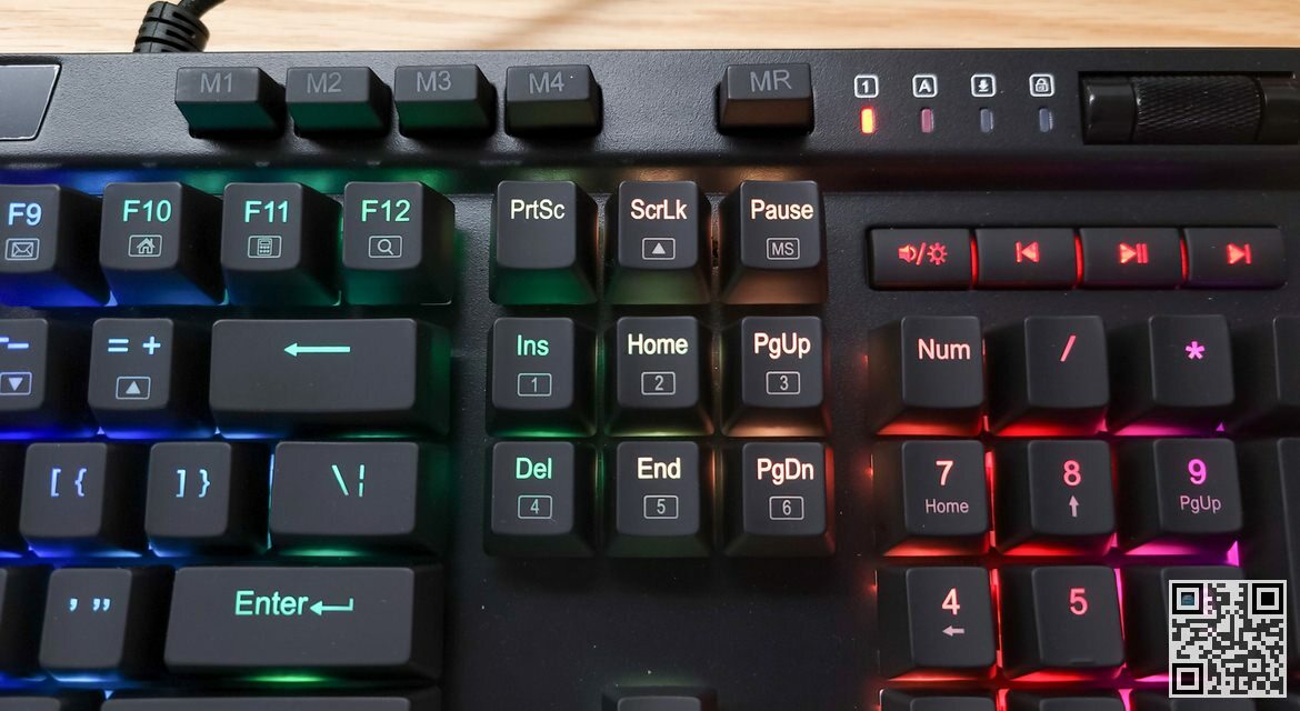 鍵盤,最上方為自定義燈光模式,使用方式與巨集略同, MR按下之後啟動自定義燈光,選擇 M1~M4 自定義燈光按鍵,燈號快閃後開始錄製,錄製方式利用FN + → 方式選擇燈光色,接著按下對應的按鈕,該按鈕就會變色,30秒後自動結束錄製,或是按下 MR錄製完畢,只需要按下M1~M5自定義燈光按鈕就可以重現自訂的燈光,FN+MR可清除所有錄製的定義燈。