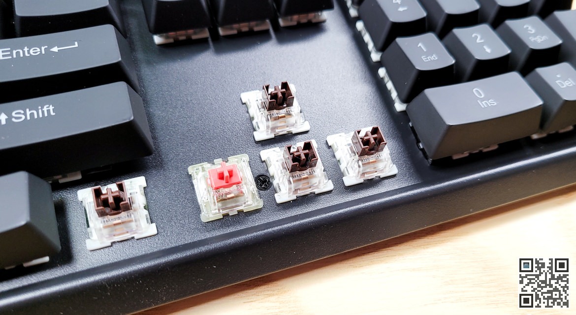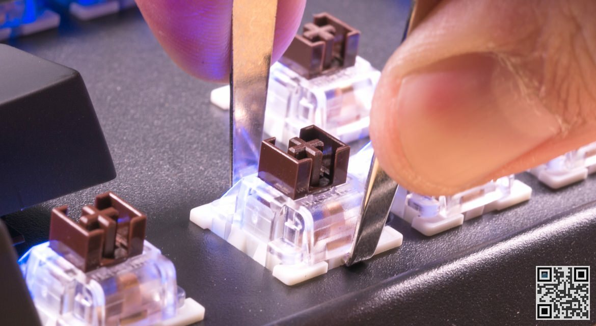 替換軸體的方式相當簡單,利用隨袋附贈的拔軸器上下夾住卡榫,輕微的晃動向上拔起就可以取出軸體。