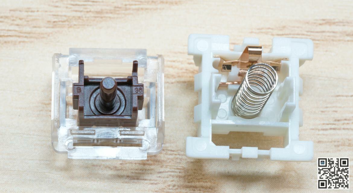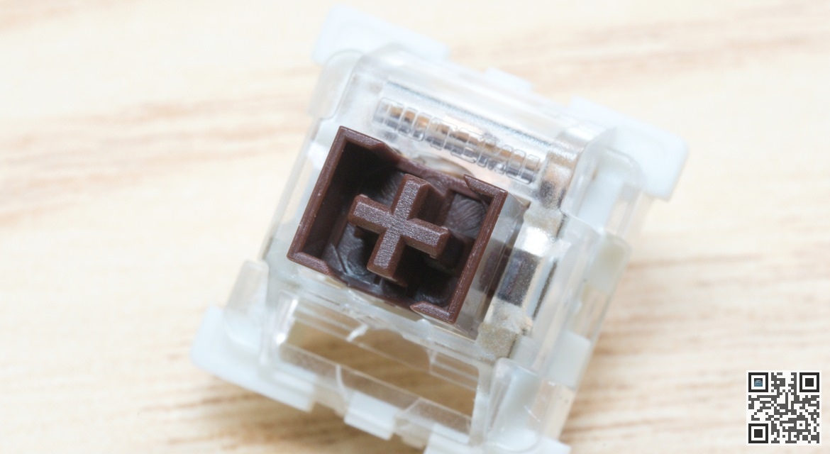 詳細看一下軸體,軸體標示英文 outemu,也就是高特軸,這個版本為防塵茶軸,茶軸設計主要設計是打感有段落,但沒有青軸那般的清脆聲響,介於紅軸與青軸那般的中間地帶。