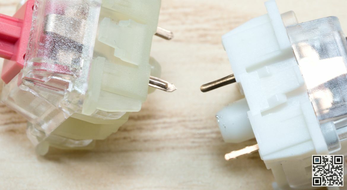 要注意的是 outemu 高特軸的針腳,屬於套筒針腳,針腳都有特殊處理過,有點弧度折彎,在套筒替換軸體的設計上更好替換,左邊可以看到 cherry 原廠的軸體,比較偏向於扁平,如果要裝的話其實也是可以,只需要用工具將針腳折彎,另一個針腳削薄就可。