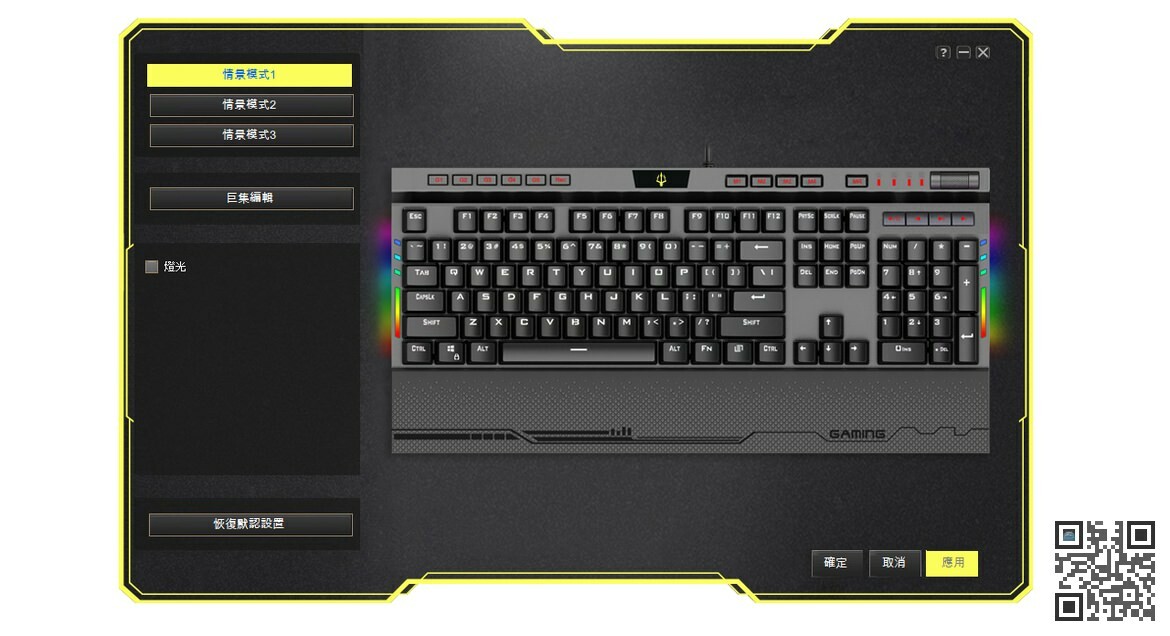 軟體打開來的樣子,主要有三種情景模式可以設定,右邊按鍵非紅色的區域,全鍵都可以選擇重新定義。軟體的右上角有個問號可以保存還原軟體設定。