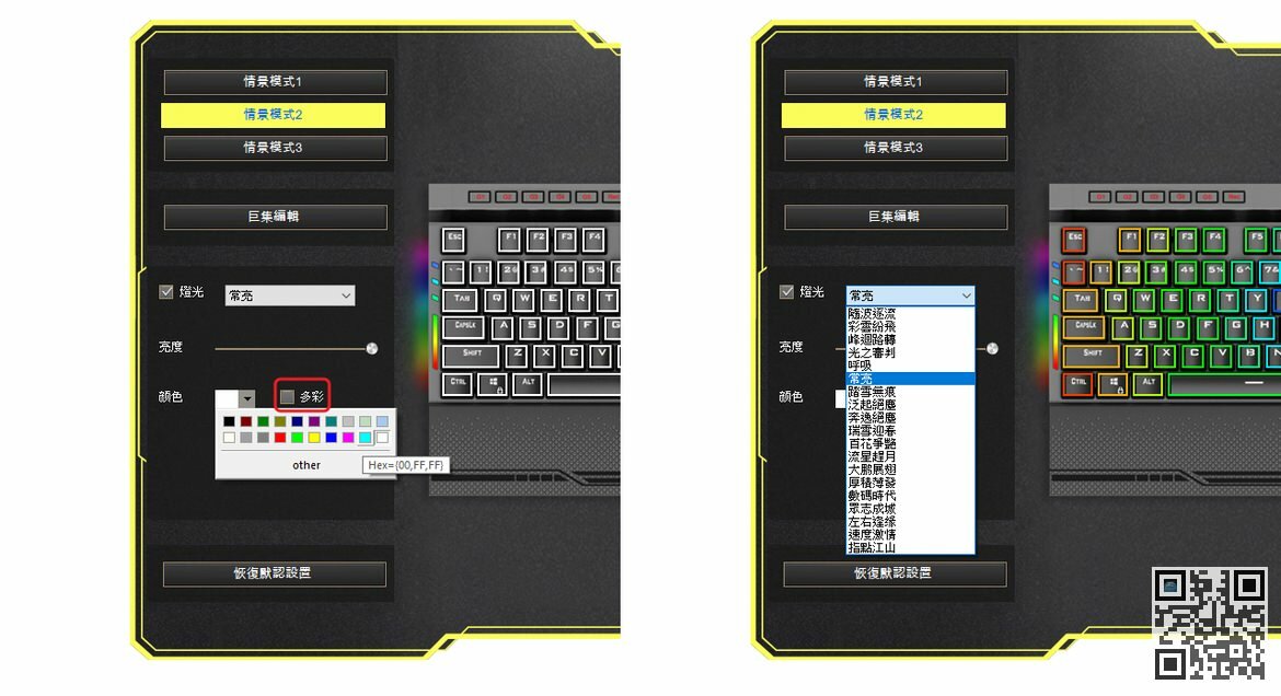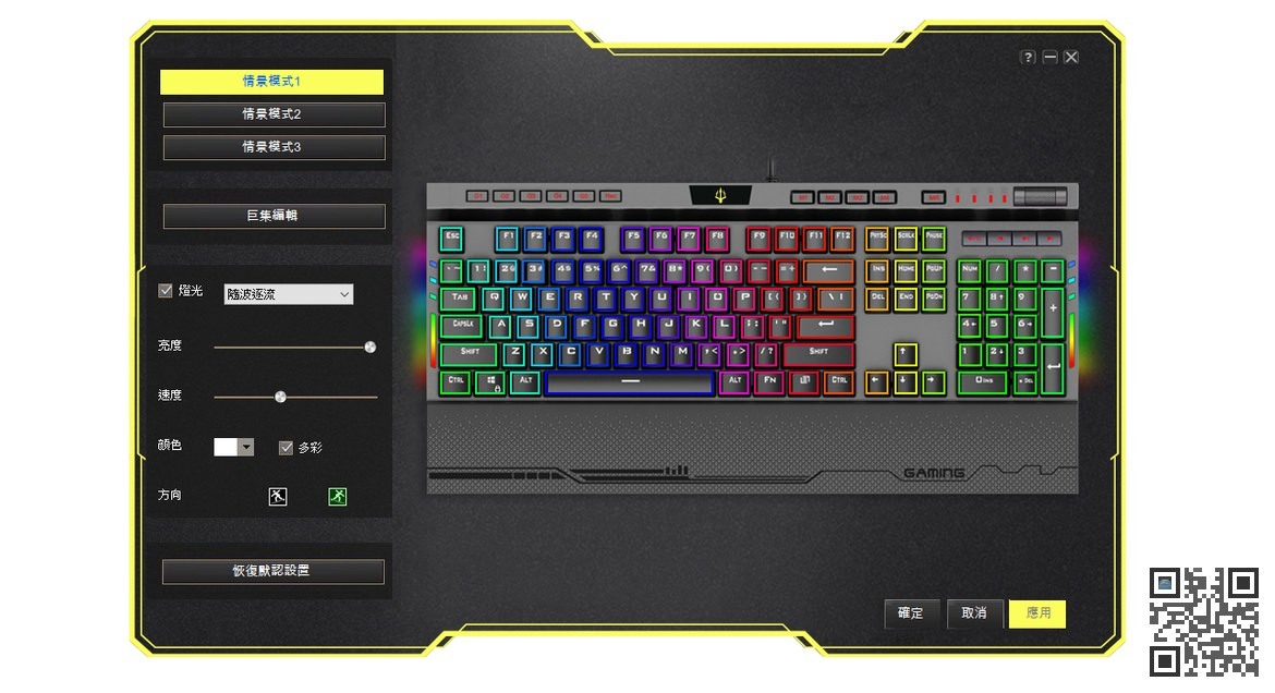 上圖右側可以看到燈色的操作設定,燈色的配置實在多樣,除了設定亮度以外,有些配置可以設定燈色的方向,或是發光指定的顏色,種類繁多有興趣弄一把來玩玩可以慢慢配置。