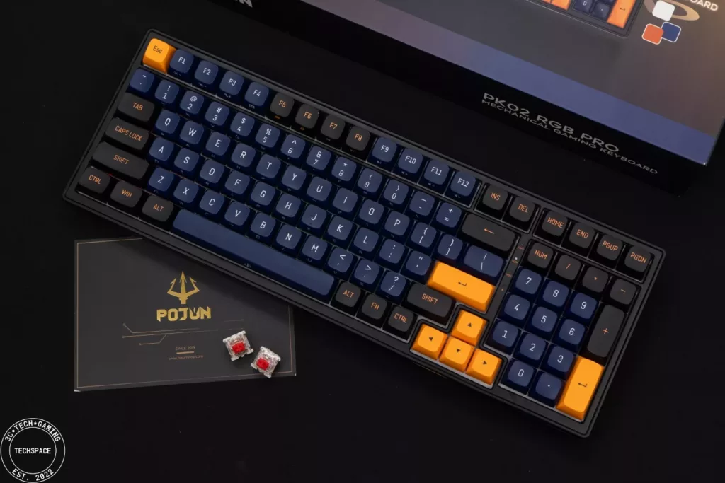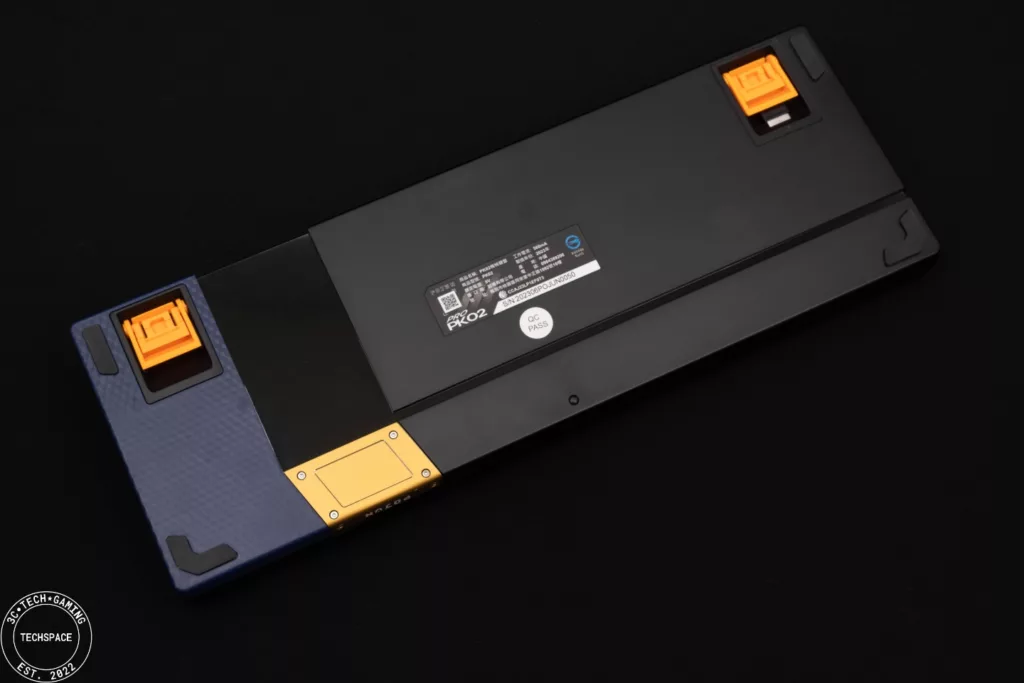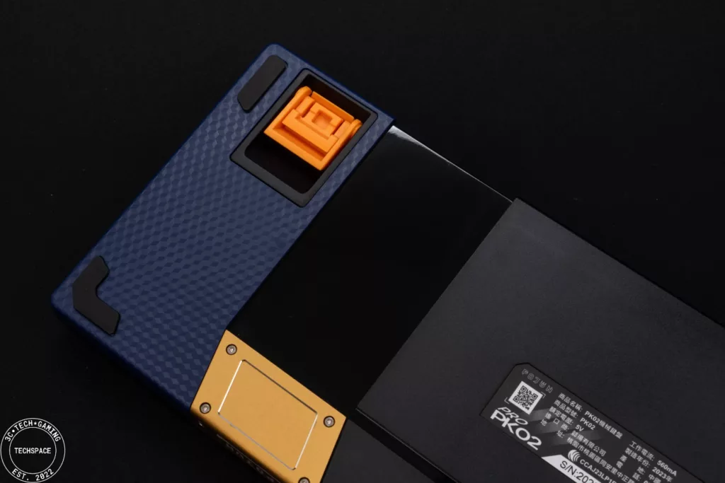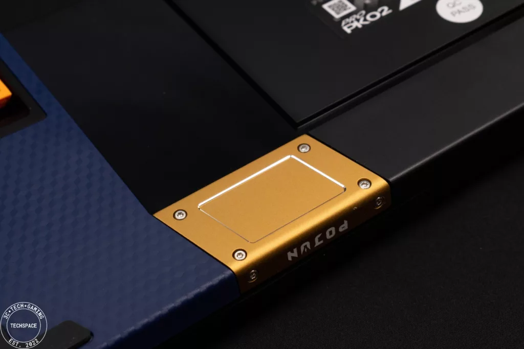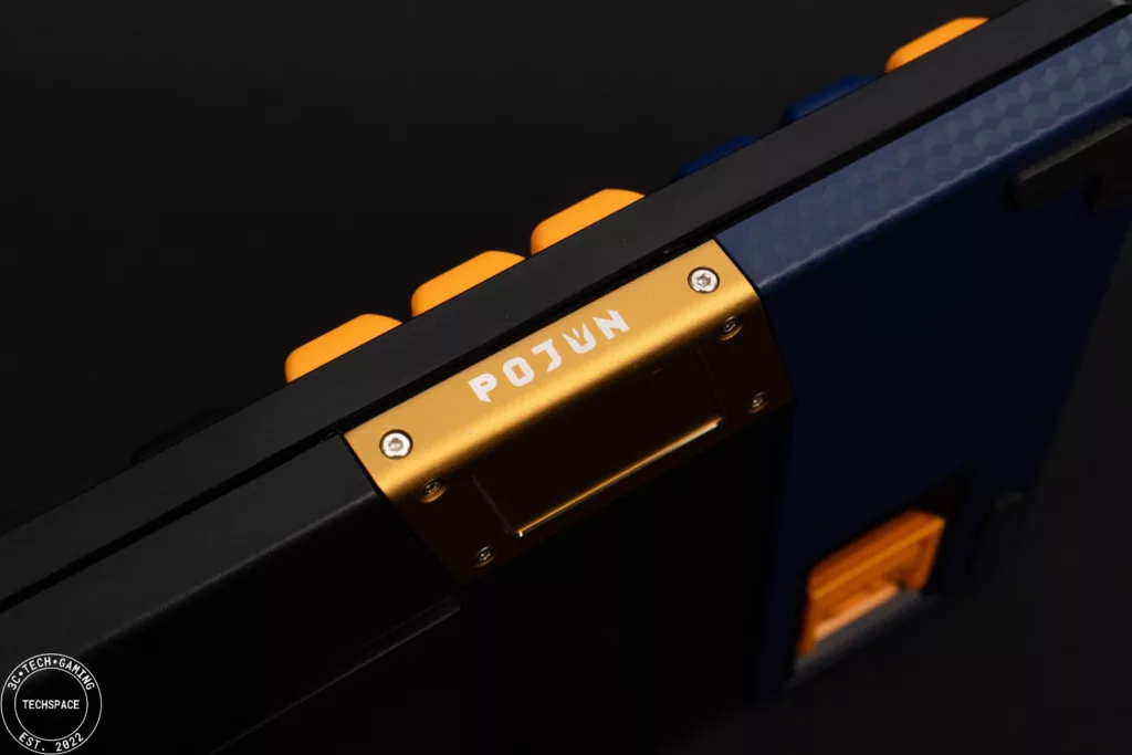 PK02 RGB PRO 無線機械式鍵盤在視覺上相當搶眼吸睛,跳色的設計近年來也吸引許多玩家,夜空藍自帶的低調加上金黃鍵帽的跳色,同時搭配環繞在鍵盤各處的格紋以及前端的 POJUN 金屬銘板,正面視覺打造的非常有質感、甚至可說是帶點信仰的存在,而鍵盤背面不對稱設計搭配鏡面延伸,更是跳脫過往的鍵盤視覺特色。