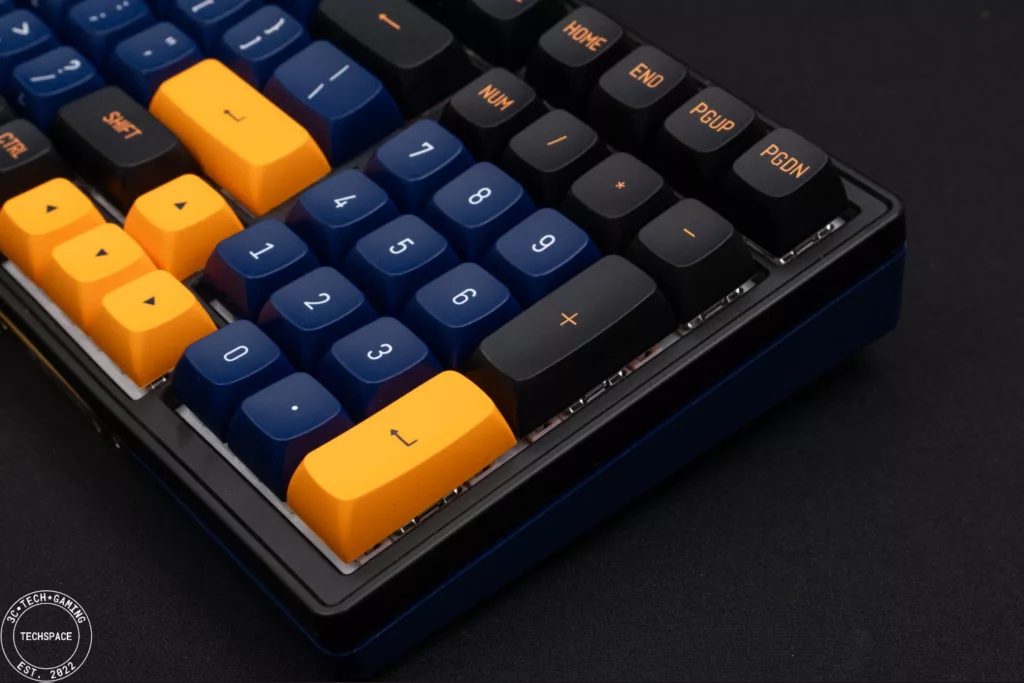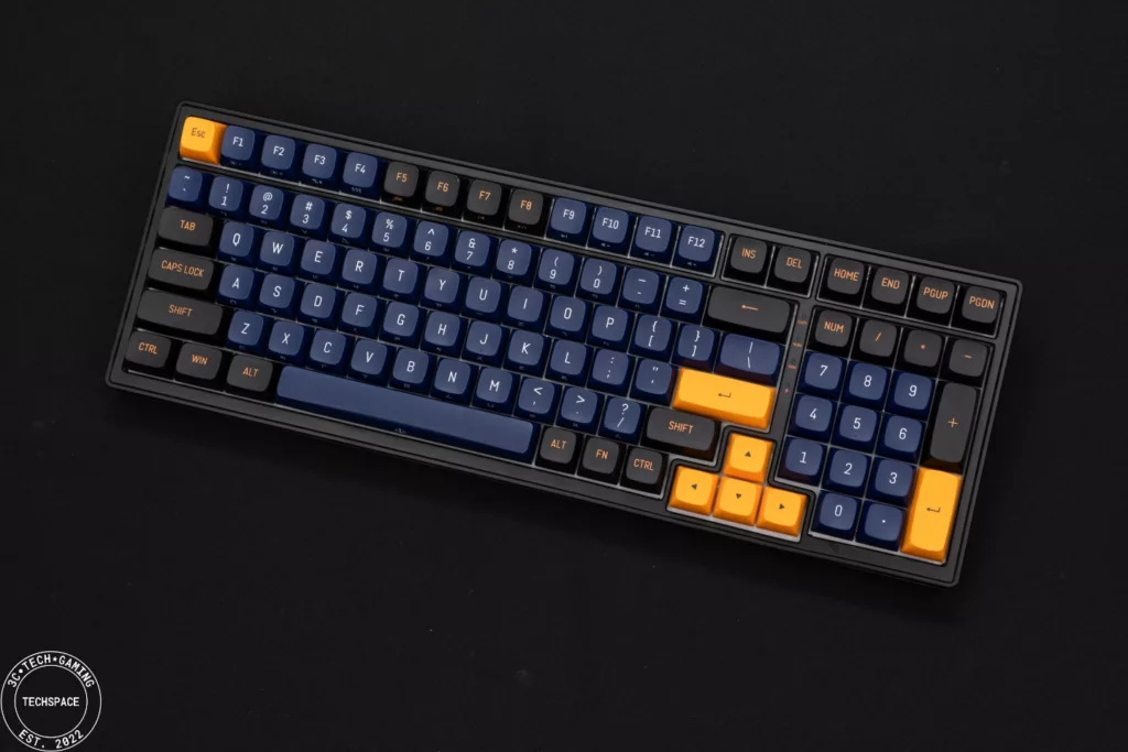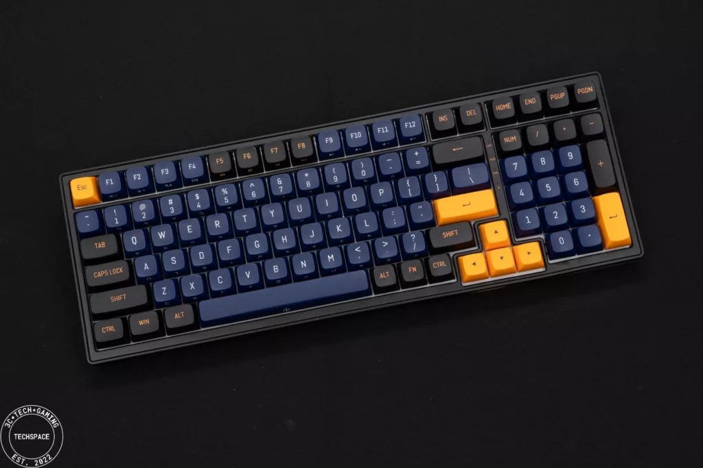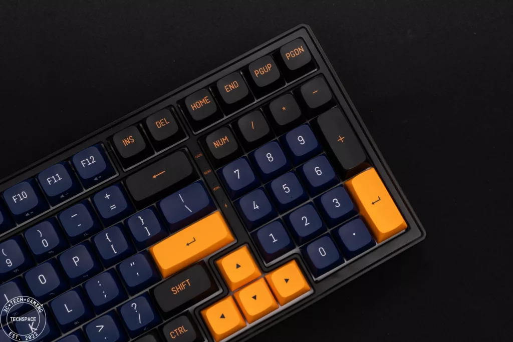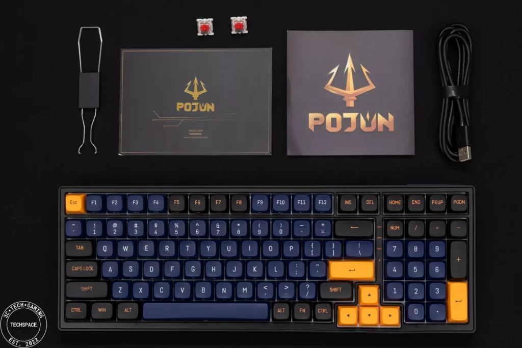 PK02 RGB PRO 無線機械式鍵盤在視覺上相當搶眼吸睛,跳色的設計近年來也吸引許多玩家,夜空藍自帶的低調加上金黃鍵帽的跳色,同時搭配環繞在鍵盤各處的格紋以及前端的 POJUN 金屬銘板,正面視覺打造的非常有質感、甚至可說是帶點信仰的存在,而鍵盤背面不對稱設計搭配鏡面延伸,更是跳脫過往的鍵盤視覺特色。