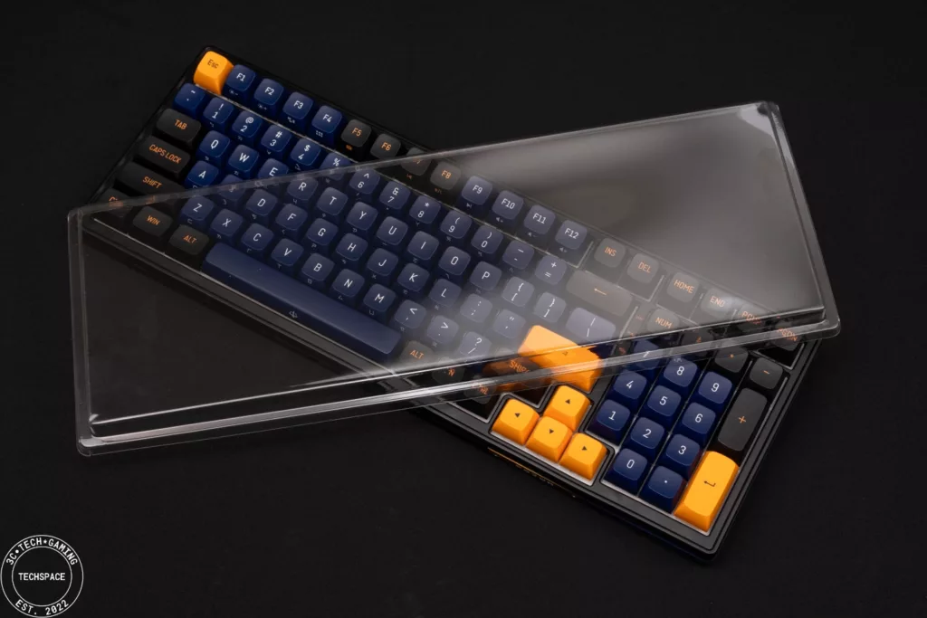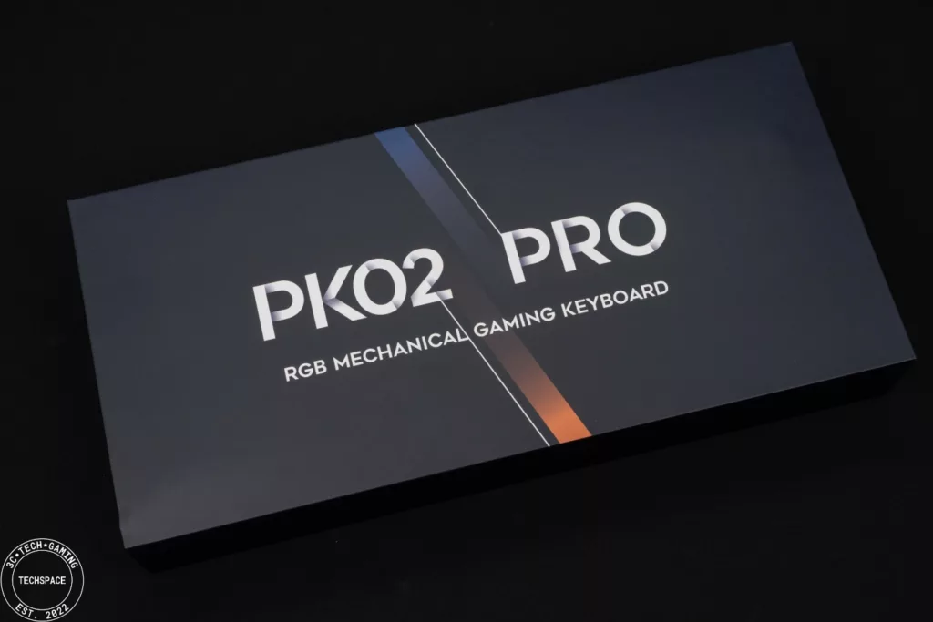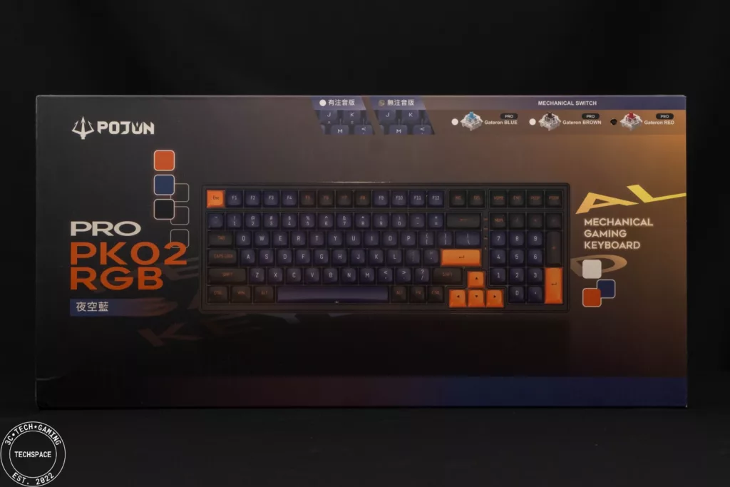 拆開外箱首先映入眼簾的是夜空藍對應的內盒包裝,標明 PK02 PRO RGB 機械電競鍵盤,同時視覺上有藍黃色對應鍵帽。