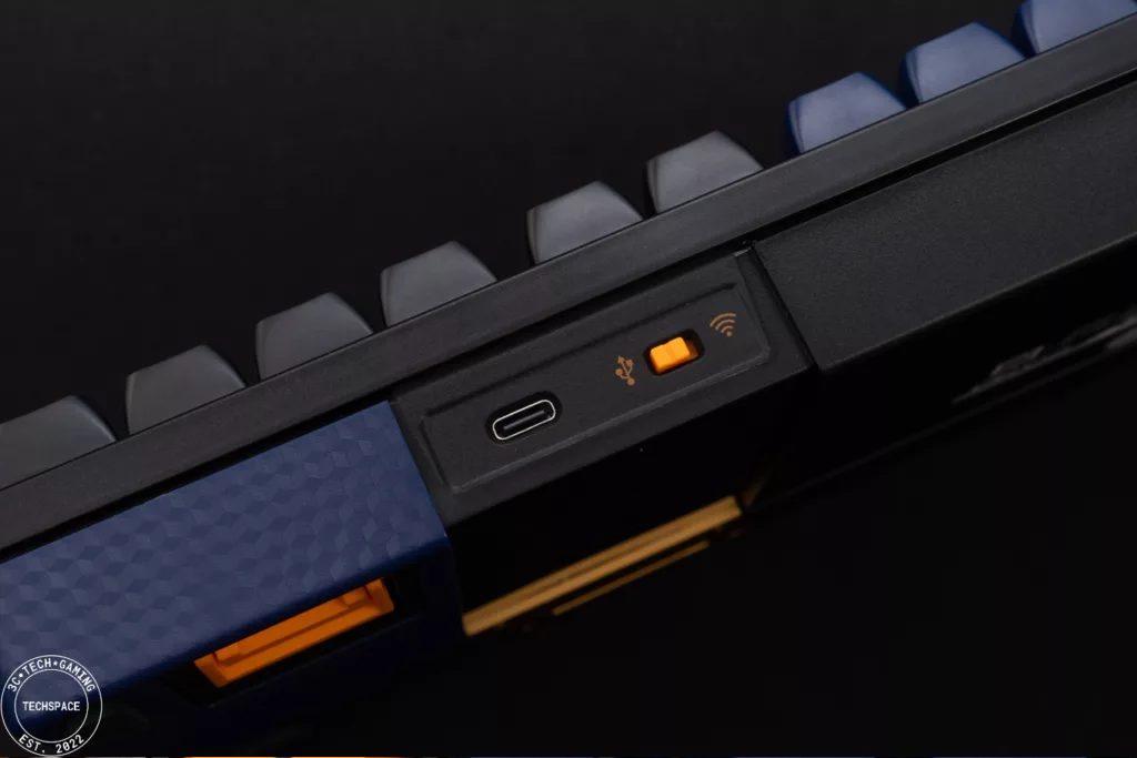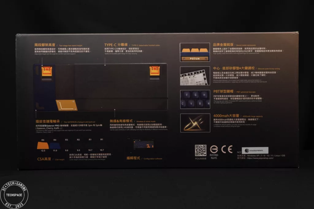 鍵盤側邊有做格紋的視覺效果點綴,同時舉目可見金黃跳色設計,比如鍵盤前端有 2.4GHz 無線接收器和藍牙模式切換開關,一旁有 Type-C 有線模式充電埠,或是後端有波軍 POJUN 的金黃金屬銘板,質感頓時提升。