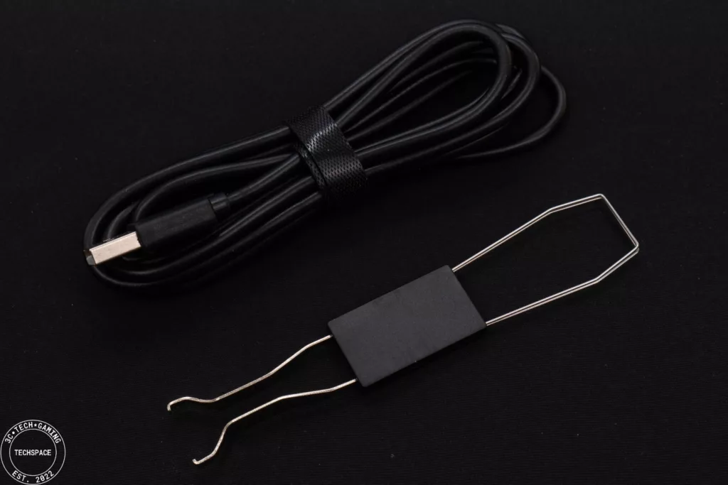 內容物部分,除了 PK02 RGB PRO 機械鍵盤本體外,另有說明和保固卡,可拆式 Type-C 線材(1.5M)、拔鍵帽軸器和額外提供的兩顆 Gateron RED 紅軸軸體可供更換。