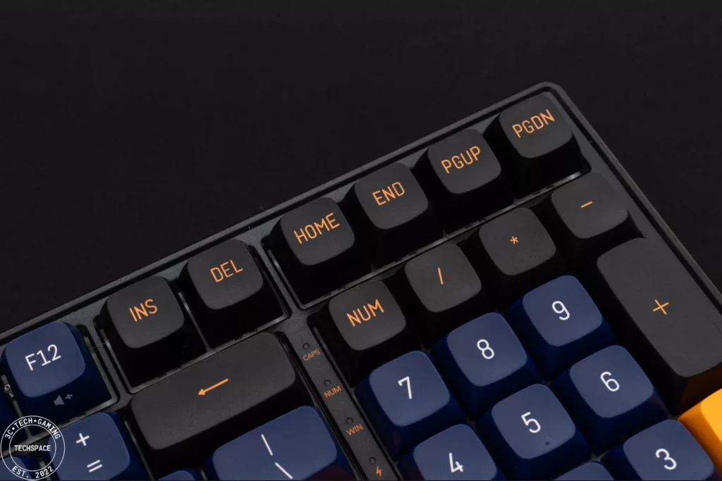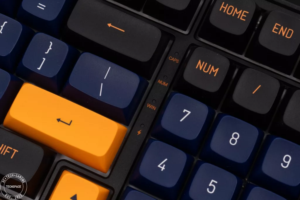 數字鍵區和 Enter、方向鍵之間有 LED 標示燈區塊,標註大小寫、數字鍵、Windows 鍵鎖定等功能,同時也有電量指示燈。