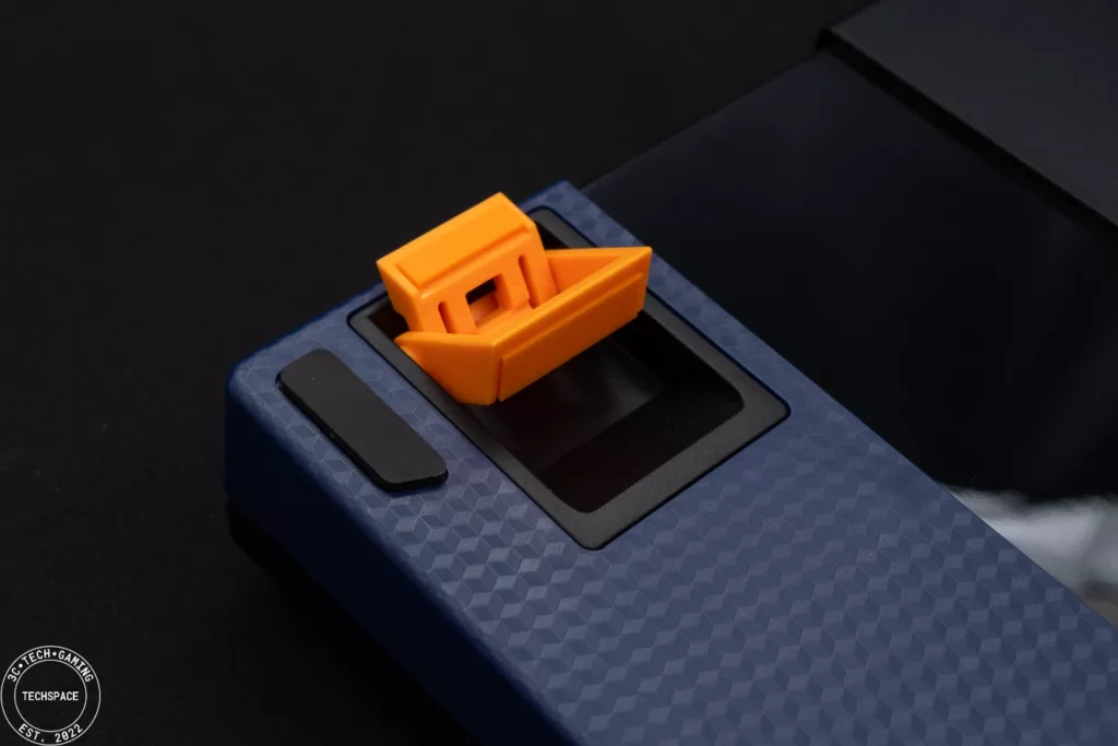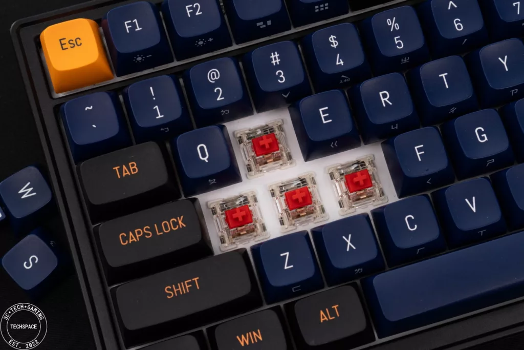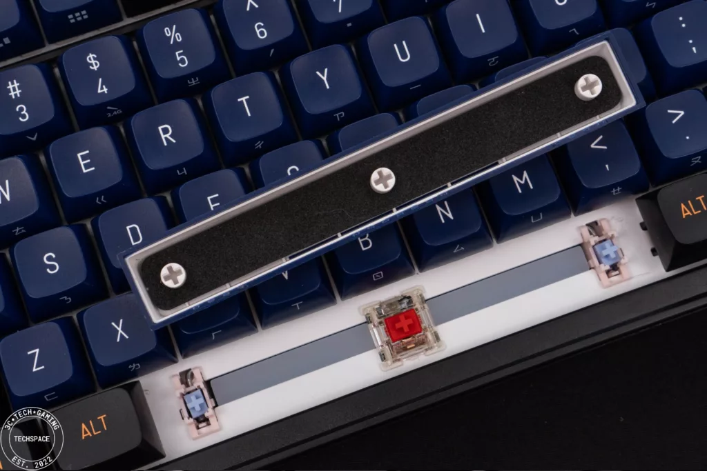 在 Enter、Shift 和空白鍵等大鍵帽部分使用精調衛星軸解決鋼絲音、雜音和觸底肉感等問題,特別的是針對空白鍵鍵帽下方為改善空腔音,增添 2mm 厚的 EVA 靜音棉,不管是敲擊手感還是聲音回饋都不錯。