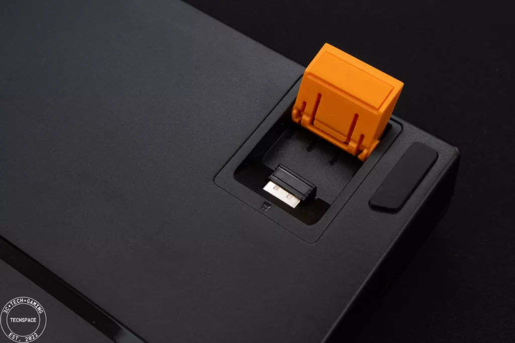 另外,2.4GHz USB 接收器的收納槽也隱身在右側腳架下方,算是額外的巧思設計。