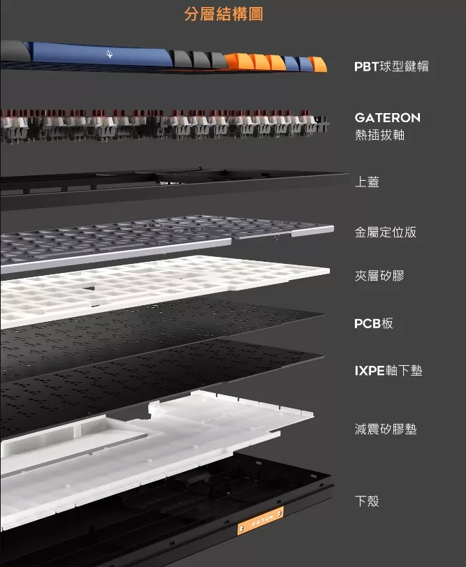 另外,針對敲擊聲響和舒適度部分,PK02 RGB PRO 採用四重消音 HIFI 聽感和手感設計,鍵盤結構內部有中心矽膠墊減少按壓回音,軸體下方則是有 IXPE 軸下墊,能將聲音集中並提供低沉反饋,最後則是底部的底殼上方也有一片矽膠墊,進一步減少震動傳遞。