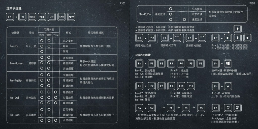 這裡附上官方說明書的圖檔與連結,鍵盤可以透過快捷鍵直接更改燈光模式、速度、亮度與方向,不得不說預設的燈效種類非常齊全,其他的像是功能快捷鍵就可以透過鍵盤上方圖示辨認。