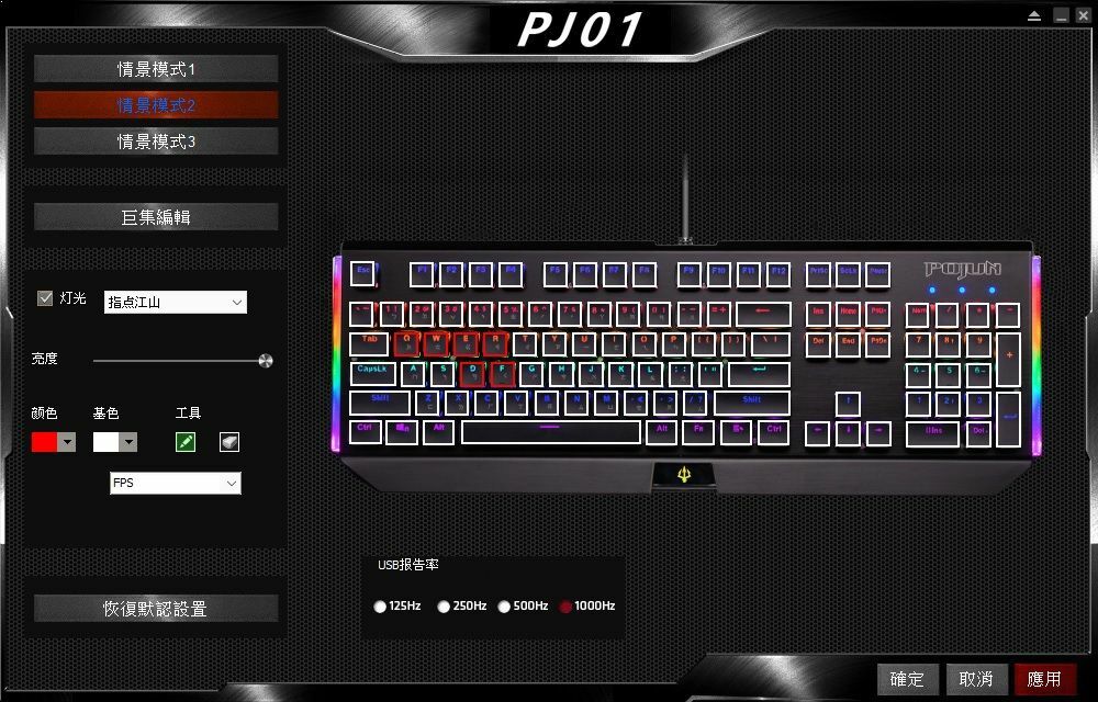 這裡還有一個比較特別的燈光模式是只能透過驅動程式來自定的,就是這個指點江山,可以透過手動的方式自訂特定按鍵顏色,舉例像是玩LoL,就可以將QWERDF調整成紅光。