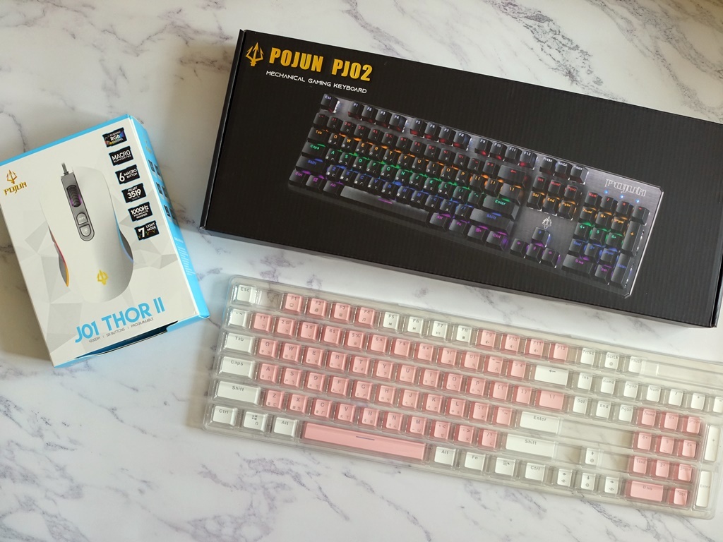 新入手的鍵盤是台灣自創品牌「POJUN 波軍」的 PJ02 粉色白光版機械式電競鍵盤,贈送一套相反配色鍵帽可更換,搭配電競滑鼠的方案只要1千出頭,以電競鍵盤來說算是十分平價~