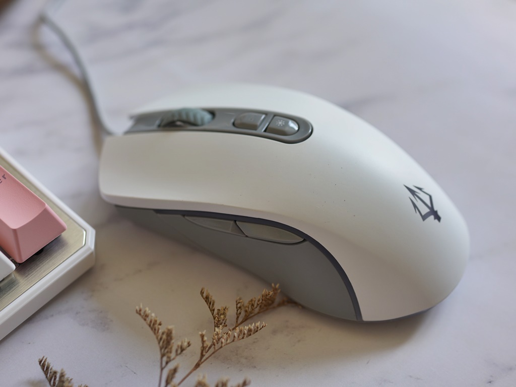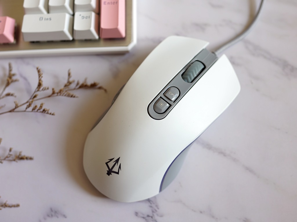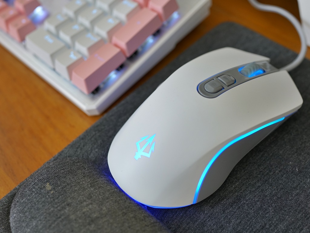 搭配同色系的電競滑鼠,大家都知道電競滑鼠是玩遊戲必備的,性能有一定的水準,與一般的滑鼠相比更為耐用,專業的術語我就不多說,我只覺得它跟 POJUN PJ02 粉白色鍵盤很搭,使用起來手感不錯,而且會有七彩光超美的~