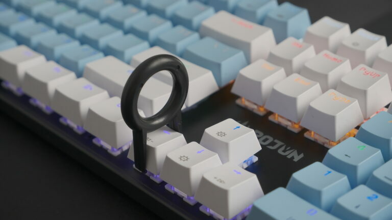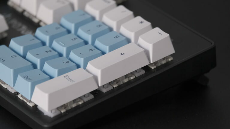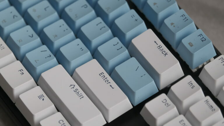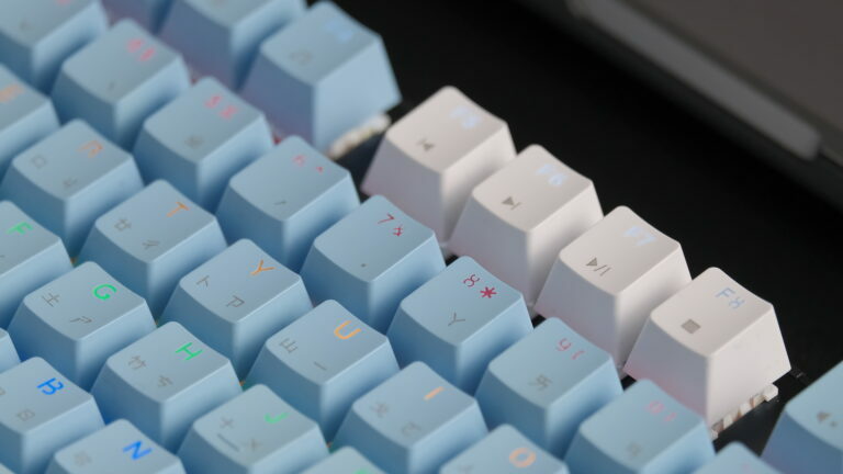 這次收到的是雙色版(藍/白),除了這款顏色外,還有黑/白、單黑色跟單白色,藍跟白的配色我覺得中規中矩,預設鍵帽則是台灣常見的英文+倉頡+注音。以我的個性來說,應該會更喜歡單色版搭配無注音鍵帽的俐落感,但這問題不大,可以之後再更換自己喜歡的鍵帽即可。