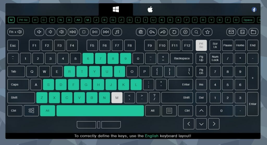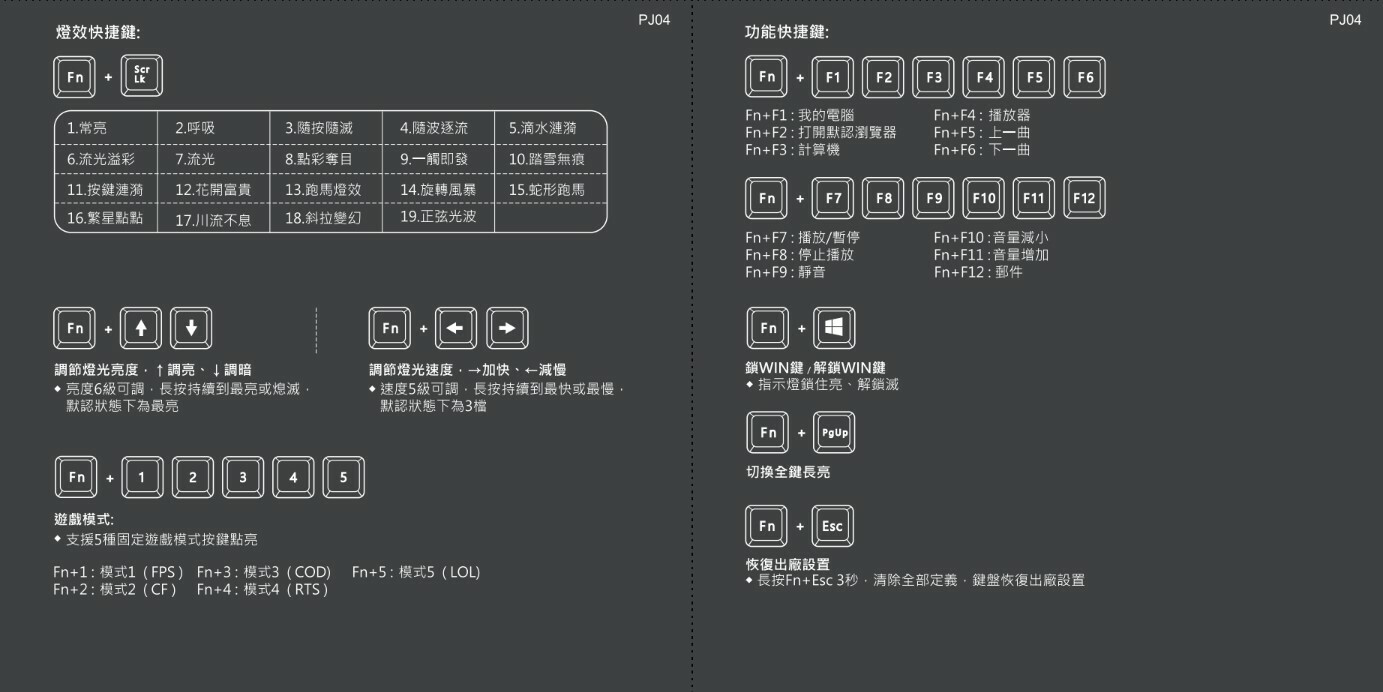PJ04 鍵盤同時也支援了五種遊戲模式之按鍵點亮,Fn + 數字鍵 1~5 可做切換